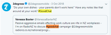 The campaign was called #GoodChat, and looked to use social media to shed some light on our communication styles in workplaces, as well as in our homes and communities. As described by 2Degrees themselves, “after chatting with more than 2000 Kiwis, we’ve discovered some eye-opening facts, so we’ve enlisted the help of some experts to help us explore the findings and how we can learn to communicate better with the people in our lives – from our partners and relatives to our friends, workmates and wider communities.”